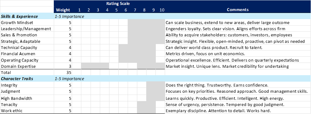 Following is a sample scorecard for a CEO of an early-stage technology firm. Note the four key components of the scorecard: job qualifications, weights, rating scale and comments.