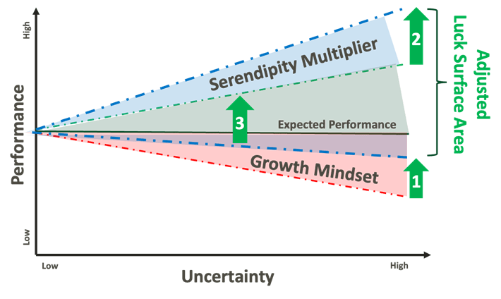 An entrepreneurial mindset shifts the Luck Surface Area upward in Figure 1 by managing risks and embracing serendipity. Entrepreneurs can adjust their Luck Surface Area by (1) mitigating the negative effects of bad luck; (2) seizing serendipitous opportunities to maximize their upside potential; and (3) expanding their Luck Surface Area by increasing exposure to serendipity. Figure 2 illustrates this three-fold strategy for influencing luck.