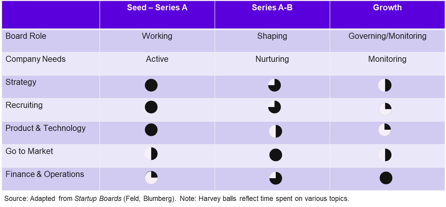 In Startup Boards, Feld and Blumberg identify three phases of Board development as a startup matures from seed to growth stage. Seed stage startups focus on the formative tasks of identifying a compelling market opportunity, recruiting relevant talent, and developing a product that fulfills market demand. Series A and B companies focus on product market fit establishing a repeatable go to market motion with a newly recruited sales team. Growth stage companies focus on scaling operations, improving unit economics, achieving market leadership, and building a predictable business.