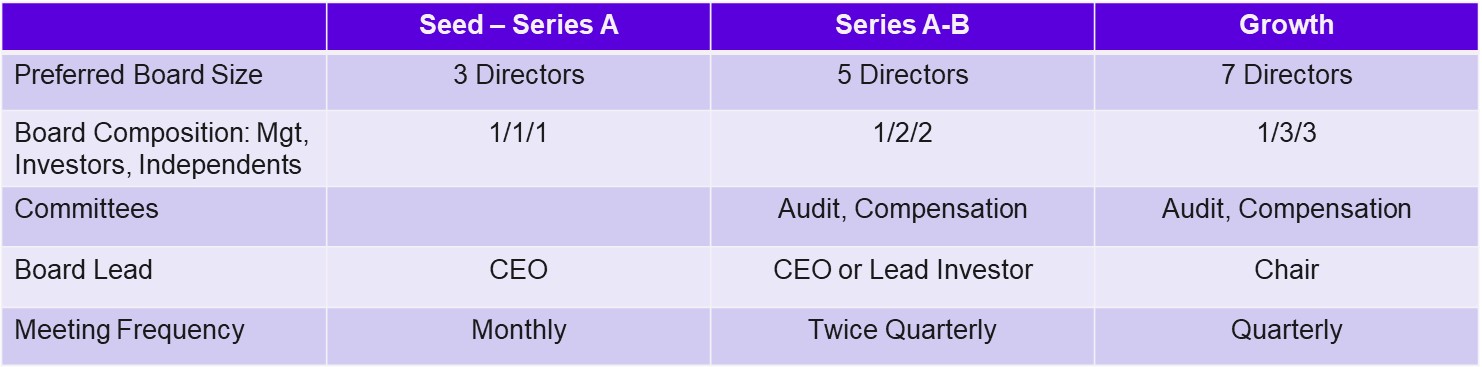 Startup Boards meet monthly to quarterly depending on business needs. Our companies average two meetings quarterly at the early stage and meet quarterly at the growth stage. Boards meet less frequently as companies scale, develop more predictable performance, and apportion responsibilities through Board committees.