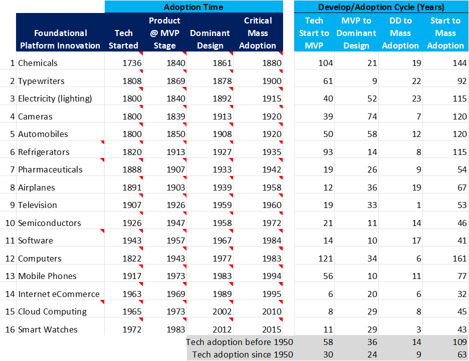 The path to Dominant Design is long and bumpy, but the road from there to mass market adoption is a paved superhighway. Among the new platform technologies adopted since 1950, just nine years were required to reach mass market adoption after Dominant Design, about a third of the time needed from working prototype to Dominant Design.