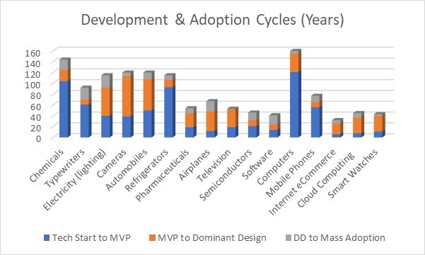 The table in Appendix 2 offers a longer perspective starting from technology inception to mass adoption. While exact dates may be debated, this exercise illustrates general product development and adoption patterns across Paradigm Shifting technologies. As Figure 1 illustrates, the time required for technology validation and product development is much longer than generally understood. But coalescing around a Dominant Design accelerates market adoption.