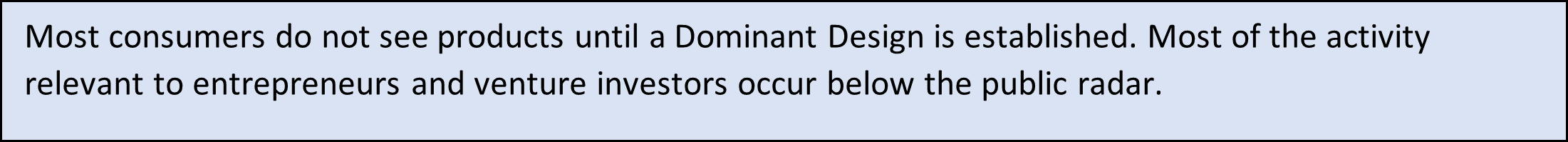 Most consumers do not see products until a Dominant Design is established. Most of the activity relevant to entrepreneurs and venture investors occur below the public radar.