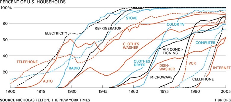 Many charts show accelerating adoption of new technologies. Appendix 1 offers one example of those widely available on the Internet. Yet these charts begin only once Dominant Design is established. The path to Dominant Design is below the public radar, yet it is what consumes time, effort and capital for entrepreneurs and venture capitalists. Based on my review of Paradigm Shifting technologies, the path to Dominant Design takes much longer than generally appreciated.