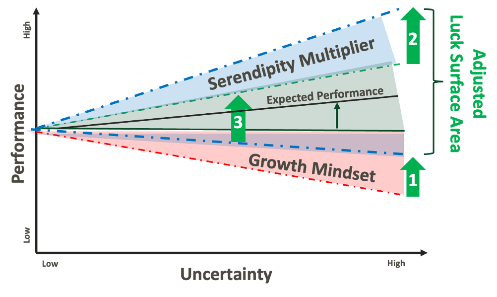 An entrepreneurial mindset augments the Luck Surface Area by increasing their exposure to serendipity. Entrepreneurs expand their Luck Surface Area with a prepared mind and positive mindset.