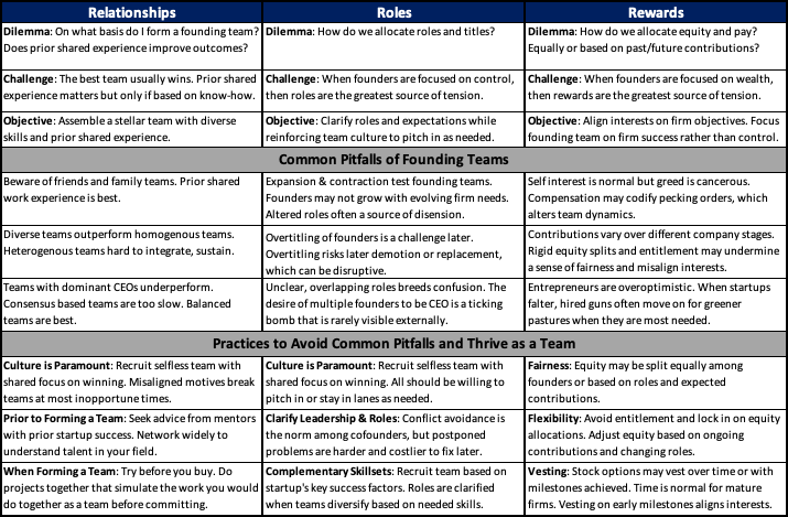 - Most startups fail from self-inflicted wounds. Invest up front to align on Relationships, Roles and Rewards.