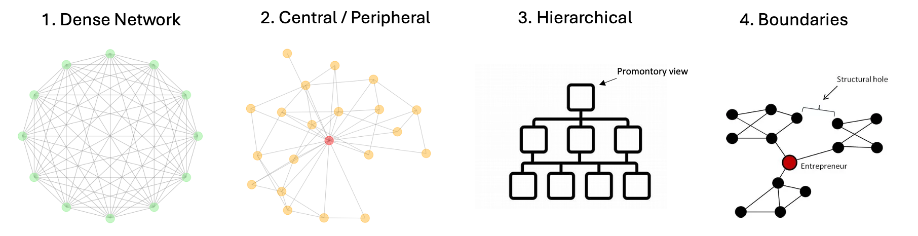 Network quality depends on network architecture. Network density is conducive to intimate, high-frequency interactions vital for building trust and sharing nuanced, complex information that lead to startup opportunities. Network centrality offers access to many connections and lots of information, while network periphery offers more perspective. Promontory positions in hierarchical networks enable both perspective and access to much information.